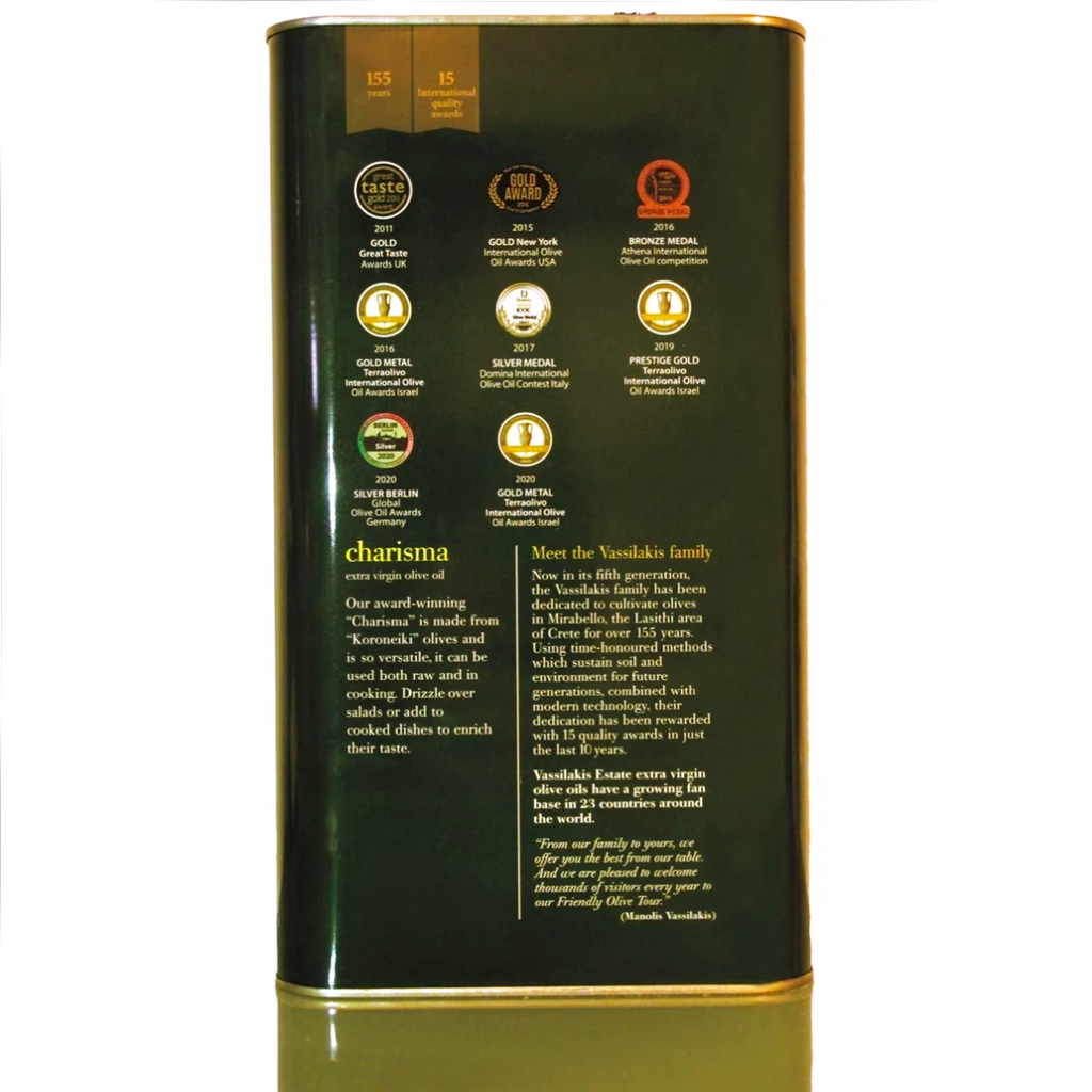 ‘Charisma’ means ‘Gift’ in Greek — and this bottle truly is. Sourced from VASSILAKIS ESTATE, a heritage olive farm with over 150 years of tradition on the island of Crete, this Organic Extra Virgin Olive Oil (EVOO) offers exceptional value for those who embrace olive oil as generously as the Mediterranean does.