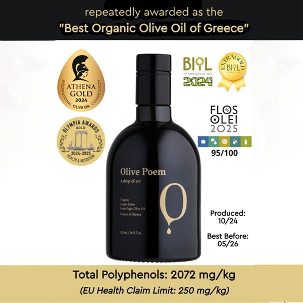 Repeatedly honored as the Best Organic EVOO in global competitions, OLIVE POEM is revered for its pungent, throat-catching freshness—a sensory marker of high phenolic content and early harvest authenticity.